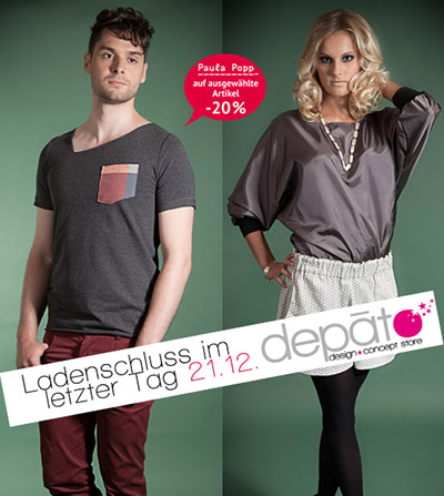 und wieder schliesst sich eine Türe... am 21.12.2013 ist leider Ladenschluss im depato store. Trotz einer sehr großen Portion Idealismus, noch mehr Anstrengung und dem Versuch in Esslingen bzw. der Region Stuttgart einen concept store aufzuziehen gibt es einige Faktoren, die letztendlich dazu führen. Den Laden zu schließen ist für die Betreiber, zu denen auch Paula Popp gehört, keine leichte Entscheidung. Wie es mit dem depato store weitergeht und wo sich für Paula Popp neue Türen öffnen erfährst du hier auf unserer Webseite, auf Facebook oder per Newsletter. Wir hören ja schließlich nicht auf Mode zu machen! Und apropos Mode, so eine Ladenschliessung bietet auch die Möglichkeit ein Schnäppchen zu machen, ab sofort gibt es auf ausgewählte Artikel 20% Nachlass! |